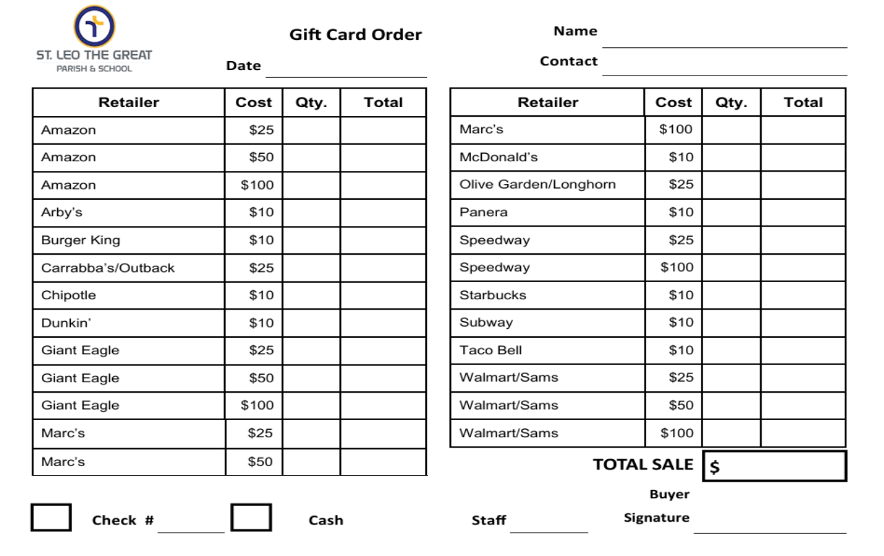 We are now accepting credit cards online. For the convenience of our parishioners, you can order and pay for gift cards from the St. Leo Gift Card Program using your credit card, debit card or PayPal, and pick up your order the next day in the Rectory Office (orders will not be mailed). For more information, please click